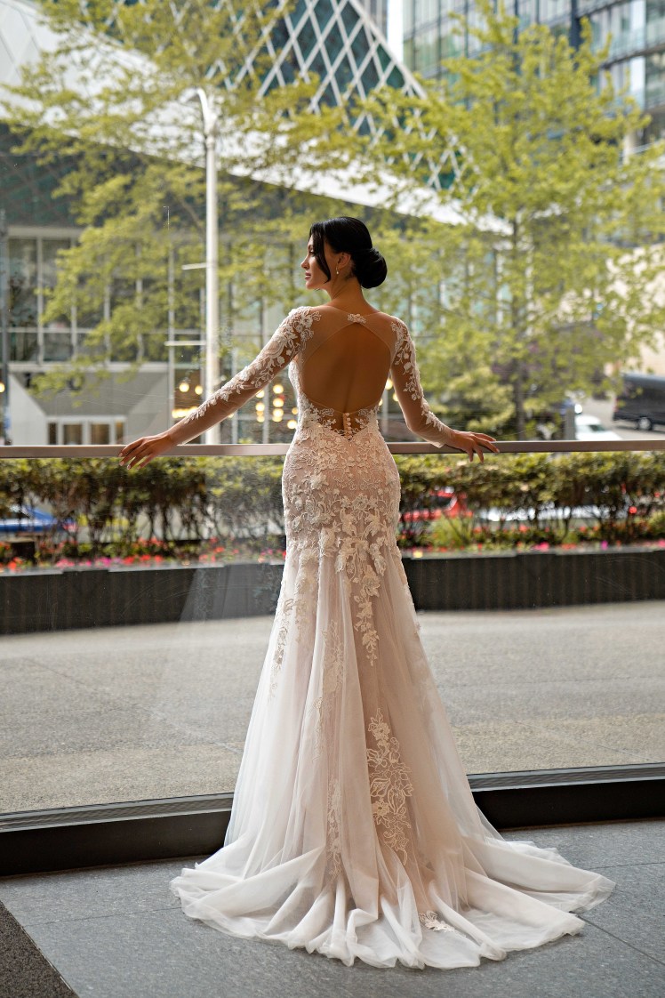 Γοργόνα φόρεμα νυφικό δαντέλα Sherol με μακριά μανίκια και φούστα με ουρά — μια πραγματική ενσάρκωση κομψότητας και πολυτέλειας. Το ημιδιάφανο μπούστο μέχρι τη μέση, με ενσωματωμένα cups σε χρώμα του δέρματος, δημιουργεί το τέλειο περίγραμμα της σιλουέτας, τονίζοντας τη θηλυκότητα της νύφης.
