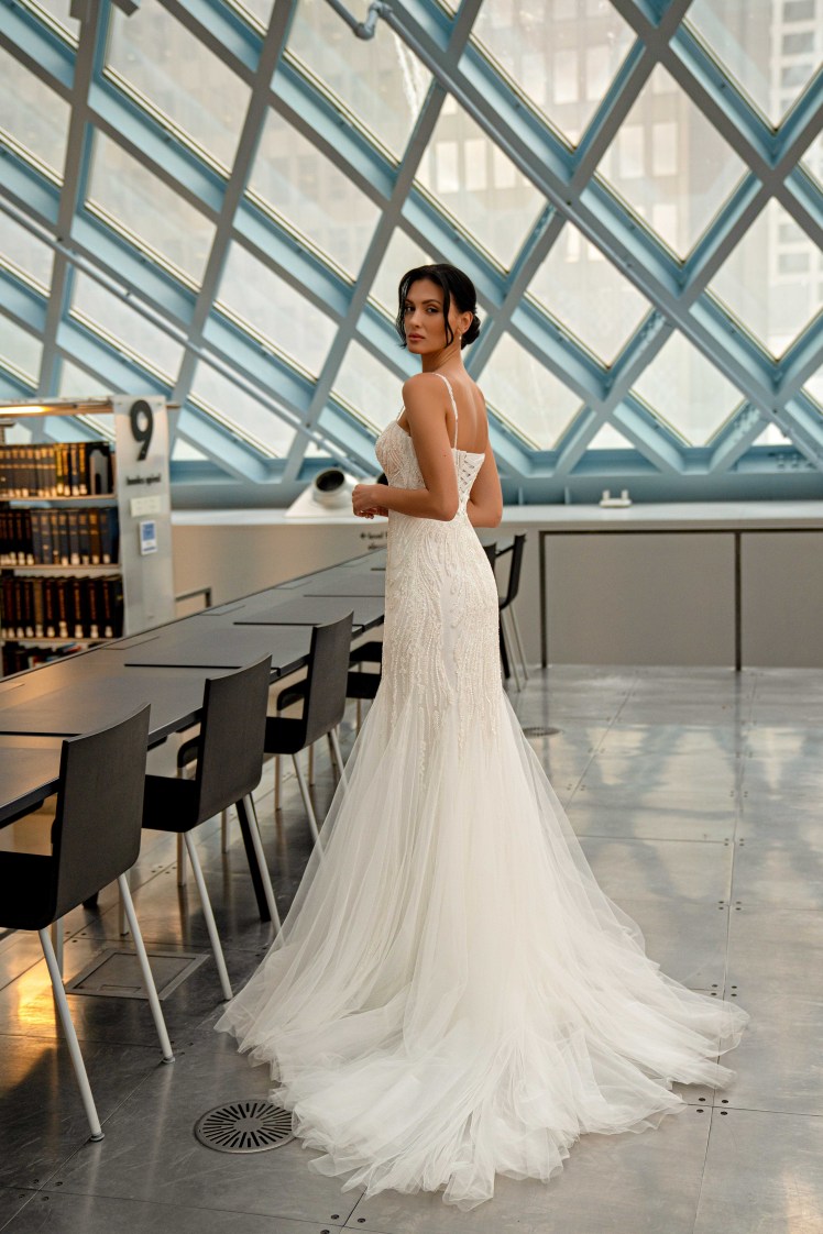Ο διάφανος κορσές με ενσωματωμένα cups στο χρώμα του δέρματος, διακοσμημένος με δαντέλα, και το δέσιμο στην πλάτη εξασφαλίζουν τέλεια εφαρμογή και άνεση για τη νύφη. Η φούστα «γοδέ» αναδεικνύει τη θηλυκότητα και την κομψότητα του συνόλου.