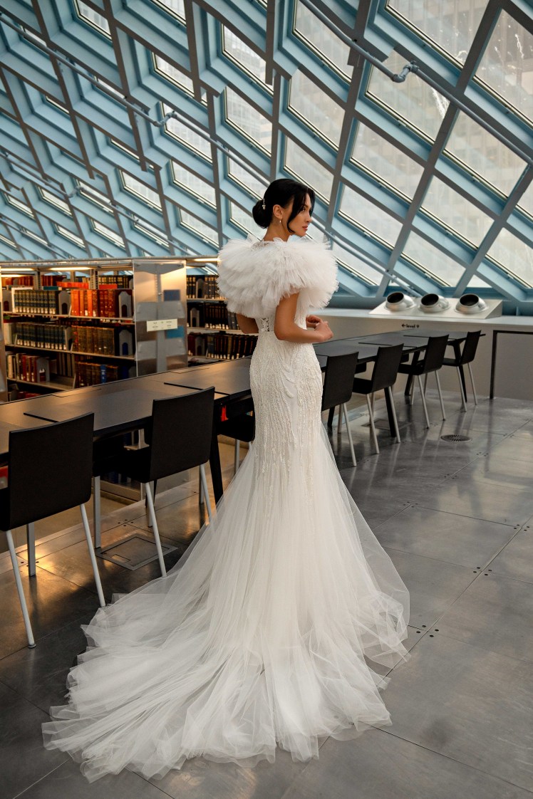Το αποσπώμενο μπολερό με χαμηλωμένους ώμους προσθέτει μια νότα μυστηρίου στο φόρεμα. Το μοντέλο είναι διακοσμημένο με γκιπούρ, κεντημένο στο χέρι με χάντρες, παγιέτες και πέρλες, δημιουργώντας μια μαγική λάμψη και αίσθηση πολυτέλειας.
