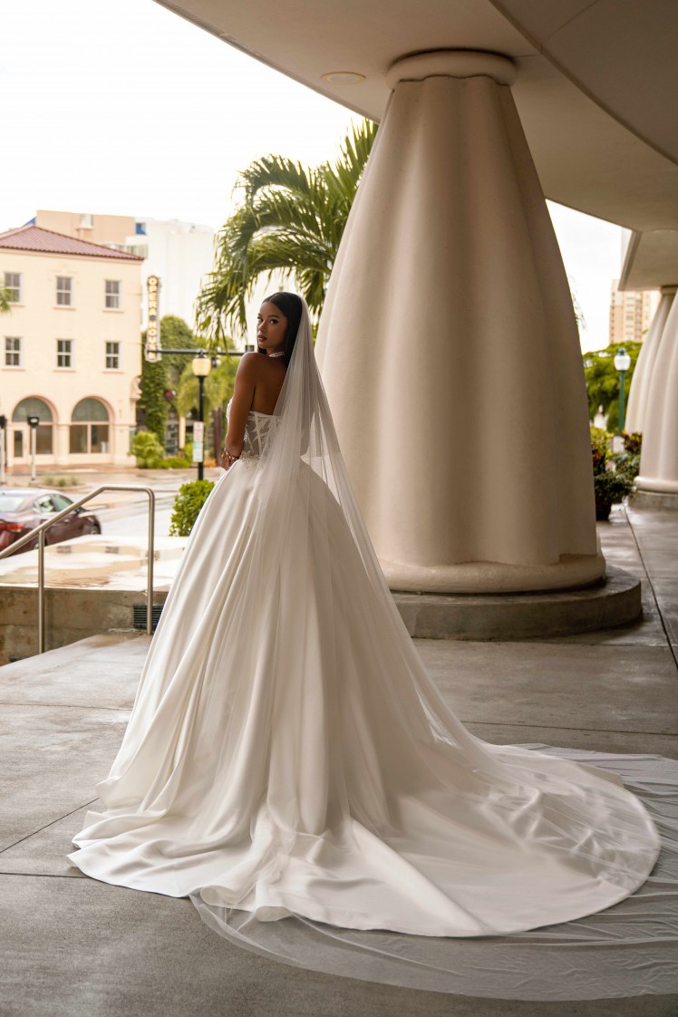 Ένα βασιλικό Νυφικό πριγκίπισσα Morgan — η απόλυτη έκφραση μεγαλοπρέπειας, χάρης και αψεγάδιαστης κομψότητας. Οι κομψά ακάλυπτοι ώμοι αποπνέουν απαλότητα και τρυφερότητα, ενώ η πολυτελής, πλούσια φούστα με ουρά χαρίζει στο σύνολο αίσθηση λαμπρότητας και βασιλικής αίγλης. Ο ημιδιάφανος κορσές αναδεικνύει τις θηλυκές γραμμές της μέσης, δημιουργώντας έναν αρμονικό και αριστοκρατικό σιλουέτα, πλασμένο για θαυμαστικά βλέμματα.