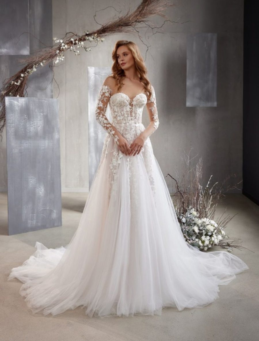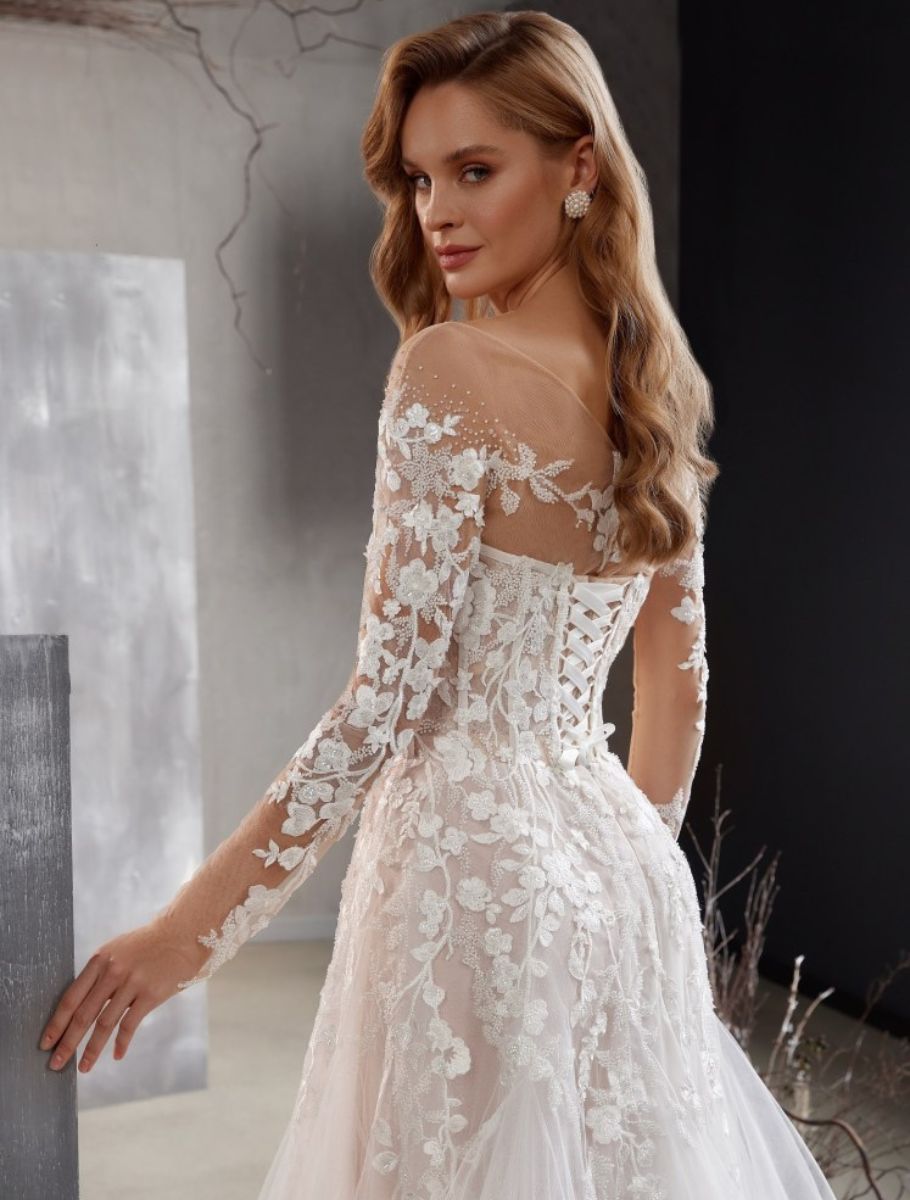 Μαγευτικό νυφικό που συνδυάζει ρομαντισμό και διακριτική πολυτέλεια. Ο αισθησιακός κορσές με ανοιχτούς ώμους αγκαλιάζει τη σιλουέτα, ενώ η αέρινη τούλινη φούστα χαρίζει κίνηση σε κάθε σας βήμα. Η δαντέλα γκιπούρ, οι λαμπερές πούλιες και τα κρύσταλλα φωτίζουν το βλέμμα, δημιουργώντας την απόλυτη bridal εμφάνιση που θα μείνει αξέχαστη.